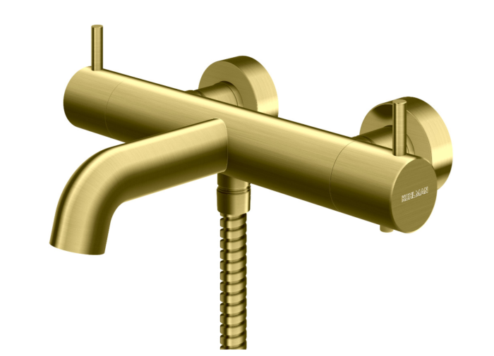 Bateria termostatyczna wannowa, bez zestawu natryskowego. Wykończenie: złoto szczotkowane. Bateria posiada perlator napowietrzajacy wodę i głowicę ceramiczną.
