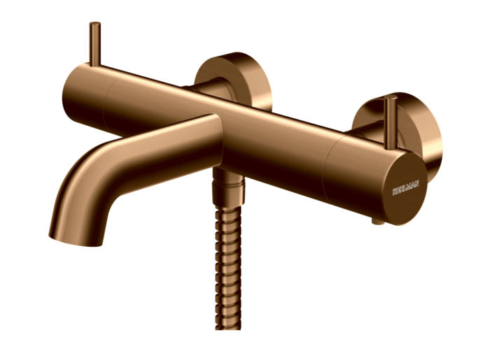 Bateria termostatyczna wannowa, bez zestawu natryskowego. Wykończenie: miedź szczotkowana. Bateria posiada perlator napowietrzajacy wodę i głowicę ceramiczną.