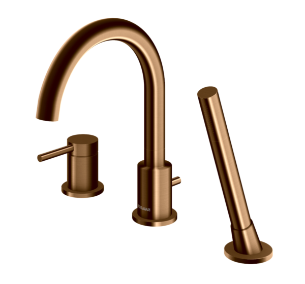 Bateria wannowa z obrotową wylewką w kolorze miedź szczotkowana.