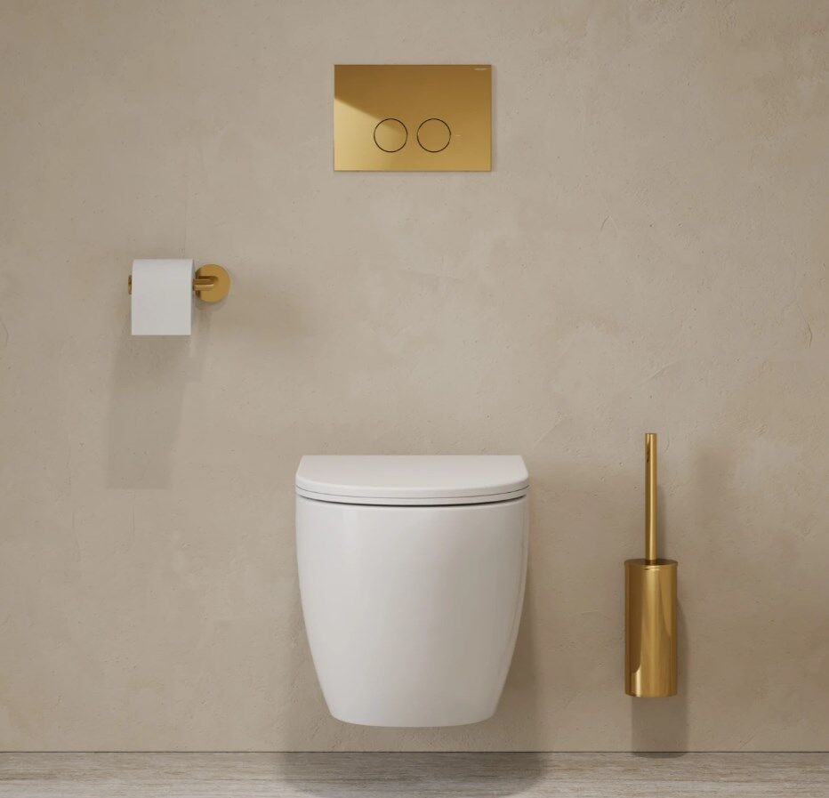 Przycisk spłukujący jest wykończony w kolorze złotym – szlachetnym odcieniu o eleganckiej, jasnej barwie i idealnie gładkiej, lśniącej powierzchni. Powłoka została wykonana w zaawansowanej technologii PVD.