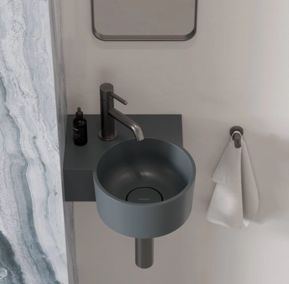 OVO w kolorze ash grey (RAL7022) to umywalka w eleganckim odcieniu ciepłej szarości, o aksamitnej w dotyku, matowej powierzchni.