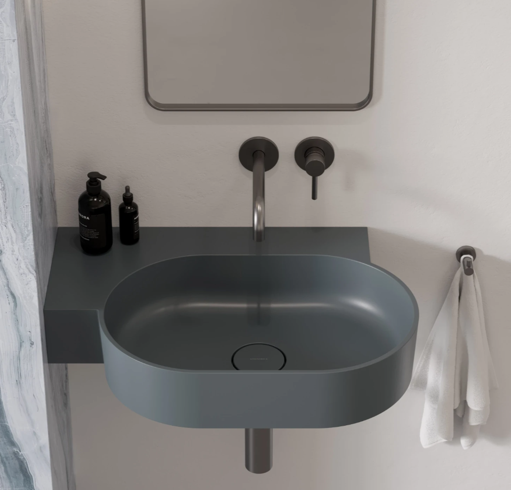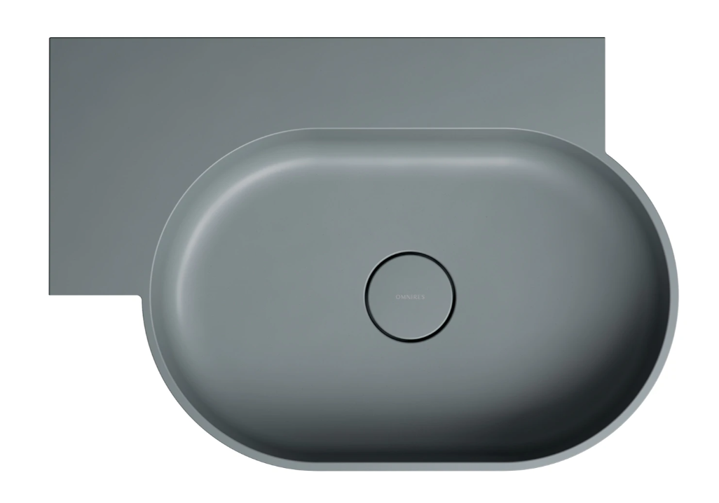 OVO w kolorze ash grey (RAL7022) to umywalka w eleganckim odcieniu ciepłej szarości, o aksamitnej w dotyku, matowej powierzchni.