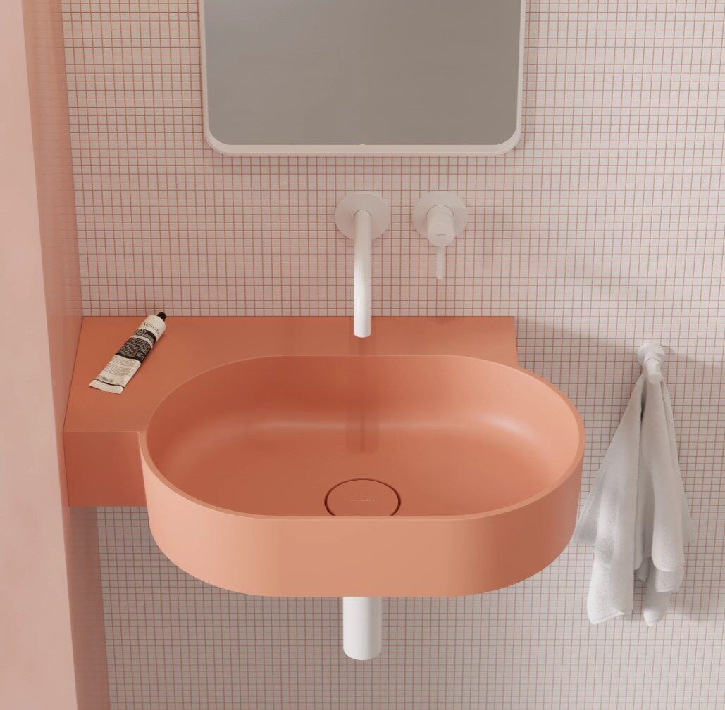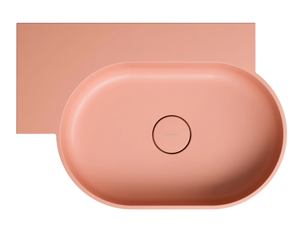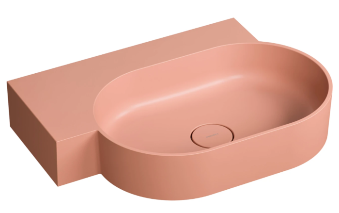 OVO w kolorze coral (RAL3012) to umywalka w subtelnym odcieniu różu, o aksamitnej w dotyku, matowej powierzchni.