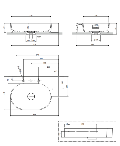 w przypadku montażu nablatowego wymagane jest wycięcie okręgu w blacie o średnicy 140 mm