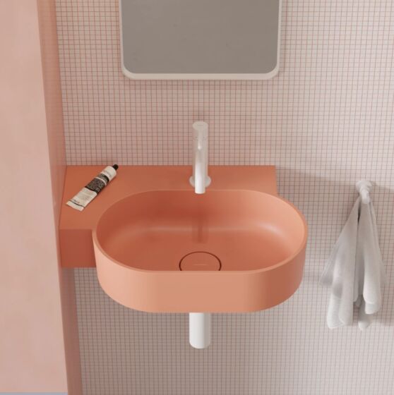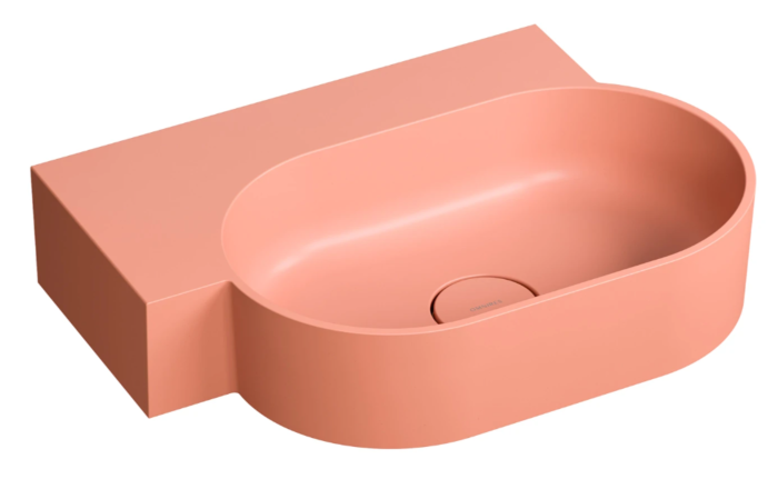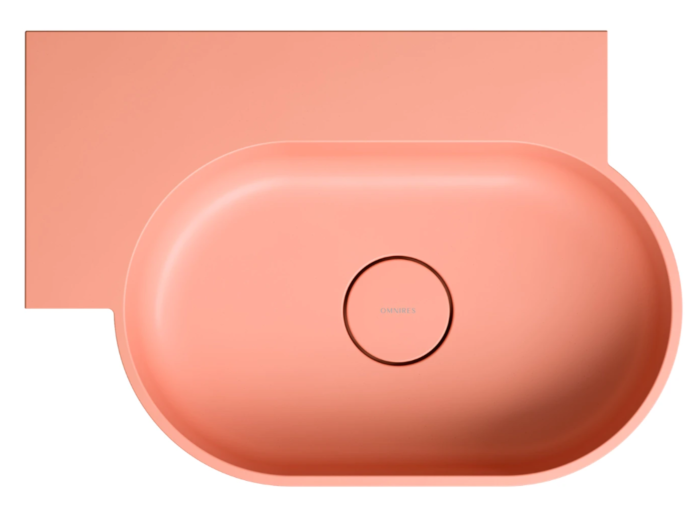 OVO w kolorze coral (RAL3012) to umywalka w subtelnym odcieniu różu, o aksamitnej w dotyku, matowej powierzchni.