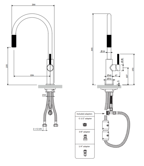 Bateria jest dostępna z kompletem uniwersalnych przyłączy do podłączenia dowolnego zestawu filtrującego montowanego w standardowej szafce pod zlewozmywak.