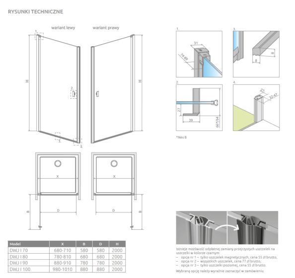 Rozmiar drzwi / ścianki | 68 cm, 69 cm, 70 cm, 71 cm |