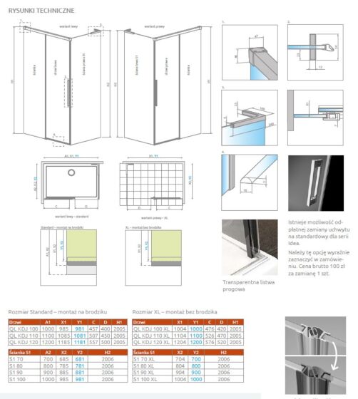Montaż: wariant XL do instalacji bezpośrednio na podłodze – sprawdza się, gdy strefa prysznica odpowiada standardowym wymiarom brodzika.