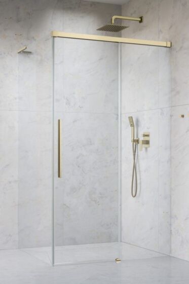 Konfiguracja: drzwi przesuwne prawa, ścianka stała w chromie oraz ścianka boczna lewa w chromie. Kolor całej kabiny określa kolor drzwi: Złoto szczotkowane.