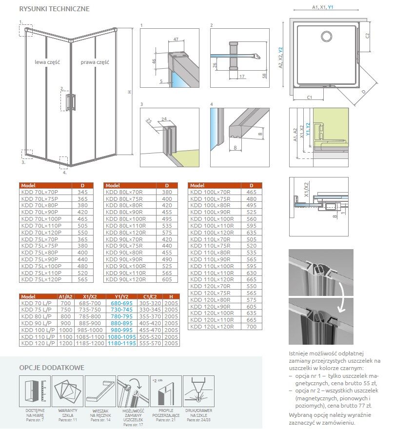 Informacja montażowa: podane wymiary są wymiarami nominalnymi. Rzeczywisty gabaryt kabiny jest nieco mniejszy od wartości z nazwy produktu. Jeżeli planujesz montaż bez brodzika – bezpośrednio na posadzce – porównaj przed zakupem wymiary gabarytowe (X1, X2) oraz wymiary do osi szkła (Y1, Y2) z rysunku technicznego, aby dokładnie określić położenie kabiny.