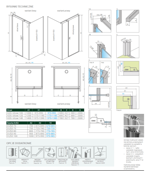 Montaż: możliwy na brodziku lub bezpośrednio na posadzce; w zestawie elementy pozwalające na instalację z listwą progową lub w wariancie bezprogowym.