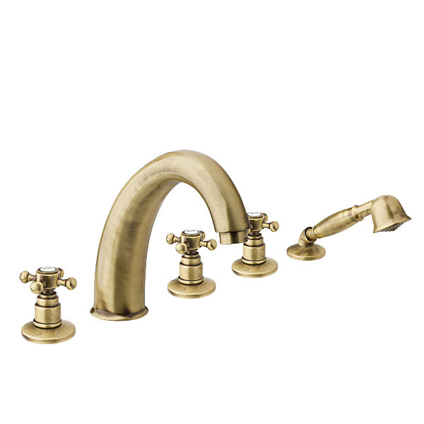 Stylistykę łazienki retro podkreśli bateria umywalkowa Atea z kształtnymi pokrętłami w kolorze starego złota.