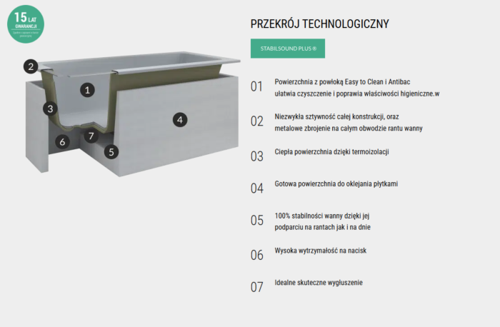 Model Artemis został wykonany w technologii Stabilsound Plus, która zapewnia doskonałą izolację termiczną i akustyczną, pozwalając dłużej cieszyć się ciepłą kąpielą oraz minimalizując hałas w łazience. Dzięki zwiększonej trwałości materiałów wanna cechuje się wyjątkową żywotnością.