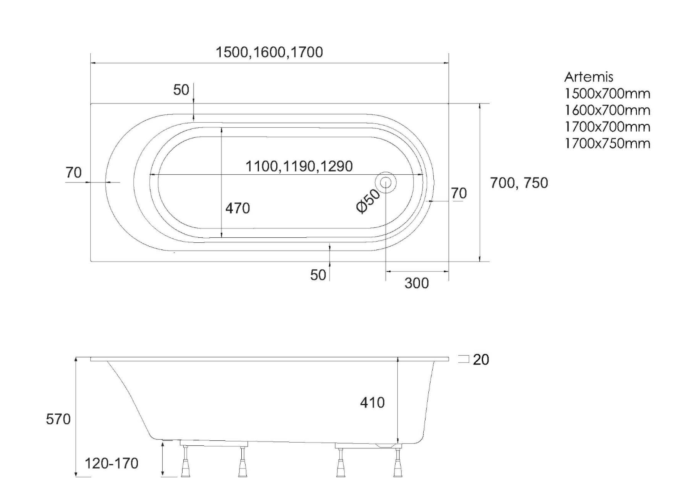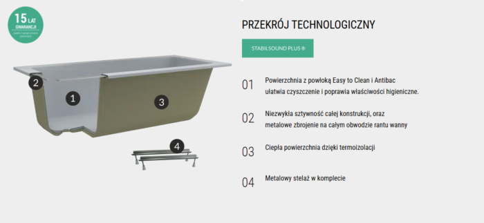 Model Artemis wykonany w technologii Stabilsound Plus, która zapewnia doskonałą izolację termiczną i akustyczną, pozwalając dłużej cieszyć się ciepłą kąpielą oraz ograniczając hałas w łazience. Dzięki zwiększonej trwałości materiałów wanna cechuje się wyjątkową żywotnością. Do zestawu dołączony jest metalowy stelaż z regulacją wysokości, co ułatwia dopasowanie wanny do indywidualnych potrzeb i specyfiki aranżacji. Artemis łączy w sobie funkcjonalność, wygodę oraz stylowy design na lata.